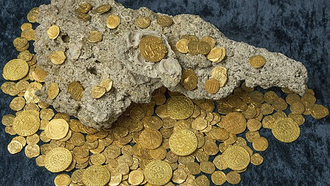 در زیر چندین نمونه از سکه ها – سنت های بزرگ، یک ریال نقره ی اسپانیایی و یک تکه ی ۳سنتی، سرهای هندی، که در محل «دست نخورده» که شبیه «نقطه ی سفید» در نقشه بود می باشد.